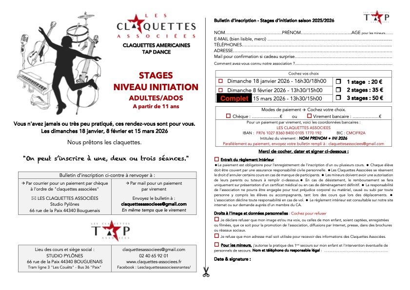 Contactez-nous si vous souhaitez recevoir le nouveau bulletin d’inscription : claquettesassociees@gmail.com
